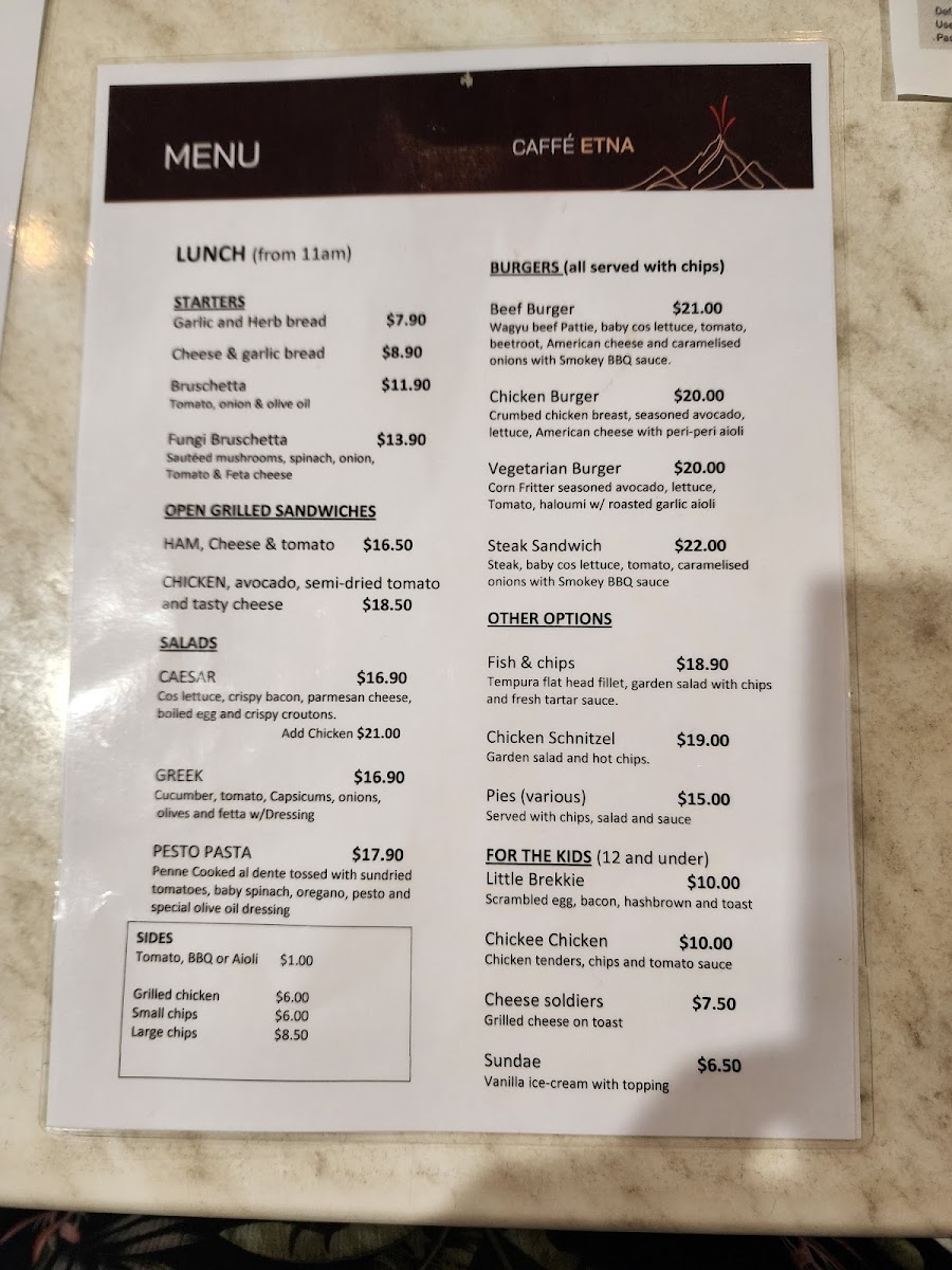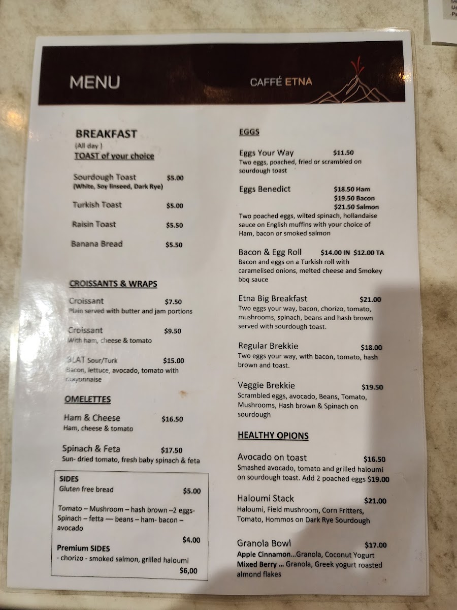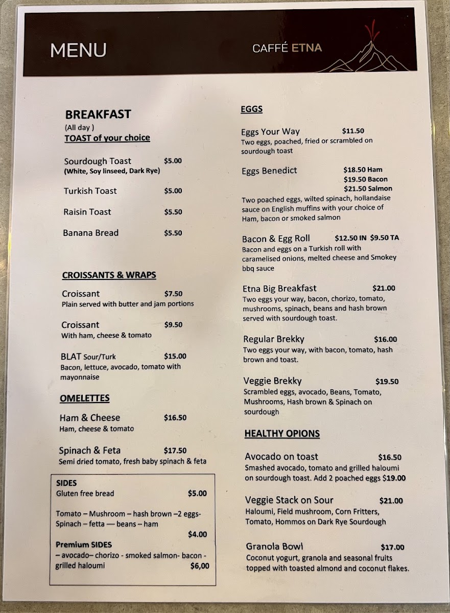 Egg-based dishes are available under the Eggs category, featuring choices like Eggs Your Way, Eggs Benedict, Bacon & Egg Roll, Etna Big Breakfast, Regular Brekky, and Veggie Brekky. These options serve well for breakfast or brunch occasions.